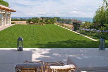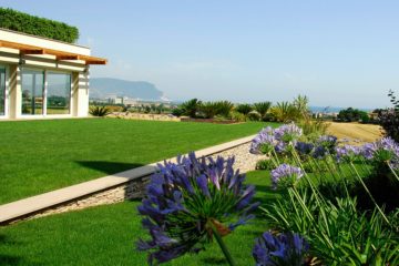 Overlooking Mount Conero, the garden with minimal and modern silhouettes surrounds the property characterized by an important architectural design. The large garden area, mainly lawn, overlooks the glazed structure; inside it there is an infinity pool. The space of frontal greenery is made essential with low growing plants, Cycas, Dietes, in order not to obstruct the view, while on the sides having other nearby structures, we have inserted very high Bamboo trees and Holm oaks.