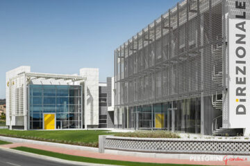 The sleek and refined building was designed by Severini Associati + Partners, spanning an area of 1,400 sqm with continuous facades to foster a seamless connection between interior and exterior spaces. The garden perfectly reflects the design concept—essential and low-maintenance. Flat areas are adorned with lawns, while sloped areas feature ground-covering shrubs, ensuring distinct zones throughout. The use of native evergreen plants with long-lasting blooms enhances the architectural structure.
