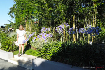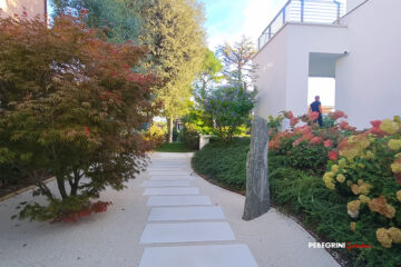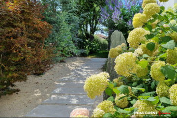A pathway made of large stone slabs guides our guests through the different parts of the garden, enhanced by flower beds filled with colorful blooms: Solanum, Agapanthus, and Hydrangeas.