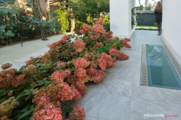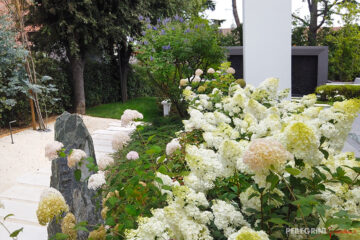 ⦁ The “zen” garden on the right side of the house, with its minimalist lines and strict appearance, was designed with a more sustainable approach, using the xeriscaping technique: sand, gravel, rocks, and no lawn, helping us conserve water, which becomes scarcer every year. The only indulgence is the beautiful Hydrangeas, which provide a stunning bloom until November. Even these are irrigated using a drip system to manage our water resources efficiently.
