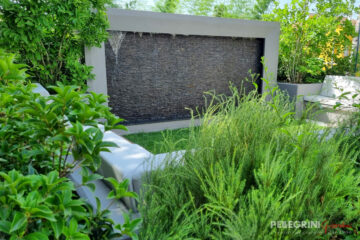 ⦁ The modern seating area, surrounded by a flowering garden, was custom-designed and built with careful consideration by the architects and landscape designers, based on the spaces we wanted for ourselves and our guests. It’s enhanced by a beautiful water wall that, together with the seating, is illuminated by LED lines at night. This architectural feature is visually striking and creates an additional sound barrier against road noise. We can enjoy the view of this stunning scene, framed by two Magnolias that offer a spectacular bloom in spring.
