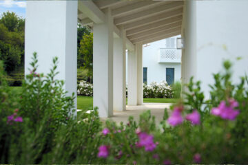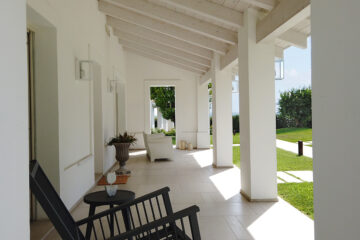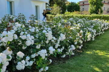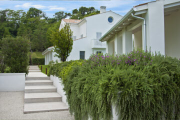 Maintaining the original architectural lines of a typical farmhouse in the Marche region, the renovation work carried out by the Architect Rosanna Orienti was aimed at creating a villa with the most modern and Mediterraneanstyle. The Mediterranean garden, designed in collaboration with the architect, was also designed to be completely in tune with the rest of the property. Large lawn areas, few precious plants with mainly white blooms. Rose aspirin, Arbutus unedo (strawberry tree), giant Agapanthus and acenturies-old Punica granatum (pomegranate) are the most visible features.