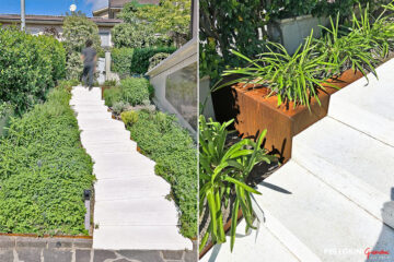 The first thing that captures attention is the new dry-laid staircase. Previously, an old, unstable tuff structure, worn by time, connected two levels of the garden. Now, with travertine steps and corten steel details outlining its edges and reinforcing the retaining walls, the staircase has become a true architectural gem. It retains the rustic charm I loved but adds an elegance and modernity that make it a striking and harmonious presence in the garden. Around the staircase, the planting of shrubs and ground covers has brought a surprising freshness. The plants seem to embrace the steps, offering a sense of softness and vitality. It’s incredible how these thoughtful plant choices have turned a previously anonymous and disorganized space into one that feels alive and lush.