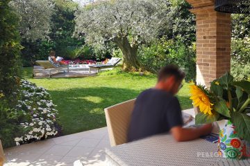 The large evergreen hedges protect us from the view of the nearby buildings, because we live in the center of a small town in the Marche region; the plants we have used grow little so as not to risk reducing the useful space of the garden which, thanks to the various blooms, is truly scenic throughout the year. Today from home we admire the two beautiful olive trees, which embrace the Spa area. Along the perimeter at the back, the inclusion of Hydrangeas with beautiful blooms, allowed us to avoid having a lawn, which requires a lot of maintenance. Flowers, many flowers like the Agapanthus, Dietes that accompany us in winter and summer along with the splendid deciduous trees, which in autumn surprise us with their colors.
