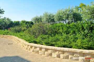 Each tree was chosen for a specific purpose. The Olive trees (Olea europea), typical of the Mediterranean scrub, alongside lush flower beds with delicate orange (Lotus maculatus) and yellow (Euryops pectinatus) blooms, mark the entrance to the main hall. The old embankment around the property was completely greened with mixed bushes and ground covers like Lonicera pileata, which are easy to maintain and require little water. To ensure greater privacy and a more natural effect, the fence was bordered with a hedge of Viburnum Lucidum, an evergreen shrub that grows lushly and requires little care.