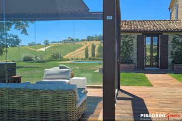 At the back of the villa, a wooden pergola was designed against the structure, decorated with fragrant Wisteria to create a truly sophisticated living area, closely connected to the kitchen. The existing trees were pruned and enhanced, left in their natural aspect to almost create an island in the garden. Next to this particularly shaded area, we placed a bioclimatic pergola enclosed in glass, complete with a mini spa pool to enjoy the outdoors even in the colder seasons.