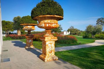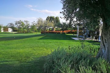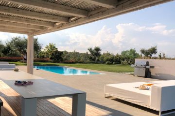 We renovated the family property, inspired by the beautiful Apulian farms. The architectural design of the building and the garden was conceived as a country residence from which to make the most of the Mediterranean landscape. It is located a few kilometers from the sea and is a wonderful house, where our family retires after intense days of work for well-deserved relaxation. Lime and lightened timber. Pergolas and ancient trees, centuries-old olivetrees, which provide shade and lighten the summer heat. The patio at the back of the house frames a geometric and essential swimming pool ,table, lounges, sunbeds to welcome friends and family on summer evenings. The entrance is reached by a long gravel path, we have enhanced and emphasized it with ancient iron vases, which stand out on the facade plastered with white lime. It is bordered by flowering bushes like Roses, Gaura, Solanum and Rosemary, not only color but also scents. All the trees chosen respect the surrounding environment;: Acacias, Cypresses, Oaks and Olives, Pines. The lawn that accompanies the natural movement of the ground is wide, surrounding the house, a rustic lawn, which still has a high ornamental value, but is easier to care for, where our children and our dog can run around.