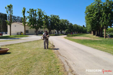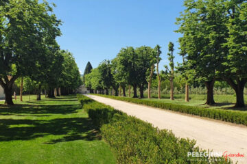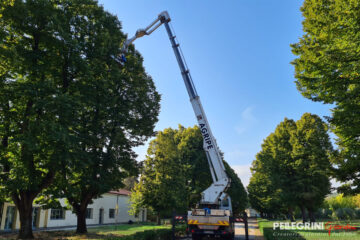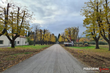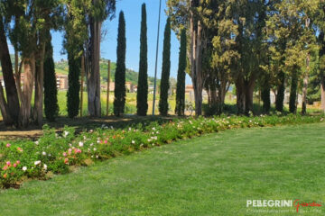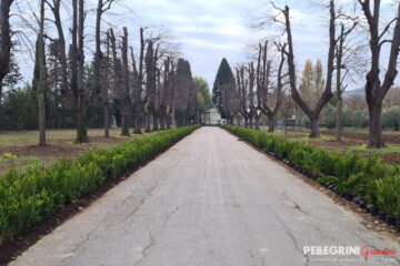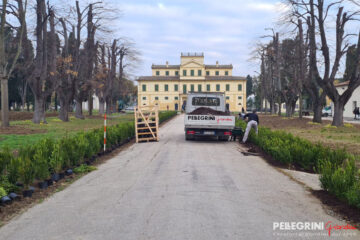 Villa Salvati venne eretta a Pianello Vallesina, una frazione del comune di Monte Roberto in provincia di Ancona, fra il 1805 e il 1820 per volere di Serafino Salvati (1755-1835), ricco proprietario terriero che fece la sua fortuna come imprenditore industriale. Il progetto in stile neoclassico si deve all’architetto romano Giuseppe Camporese (1763-1822), che vi concepì anche un ingresso solenne costituito da un lunghissimo viale di tigli. Obbiettivo del restauro del parco storico del 2021, finanziato dalla Provincia di Ancona con oltre 400.000 €, era salvaguardare il patrimonio arboreo dell’antica dimora, ma anche di consentire alla scuola interna alla proprietà, ”l’Istituto Professionale Agrario Salvati”, di fruire di spazi fondamentali per l’attività didattica in piena sicurezza. Infatti da tempo, a causa della scarsa manutenzione, gli alberi secolari di Tiglio (Tilia cordata) erano soggetti a ripetute e improvvise cadute. Quindi è stata realizzata una potatura incisiva di tutti gli alberi del viale principale, con riduzione proporzionale di altezza e volume della chioma. Inoltre abbiamo sostituito 17 Tigli mancanti con grandi esemplari, alti di più di 9 metri di altezza, provenienti dai nostri vivai. Lungo entrambi i lati del viale sono state messe a dimora ben 4.000 piante di Buxus, garantendo così l’effetto prospettico voluto in origine dall’Architetto Camporese. Anche per il restauro dell’esedra che contorna e “accoglie” l’edificio principale della villa si è proceduto ad un intervento di notevole entità. Ad una potatura controllata degli esemplari di Cipresso presenti, comprendente l’eradicazione degli esemplari danneggiati e instabili oltre che di altre specie aliene, è seguita la messa a dimora di 34 grandi esemplari Cupressus sempervirens necessari per la ricostituzione di una cortina arborea di grande effetto paesaggistico. L’intervento ha contemplato anche realizzazione di un impianto di irrigazione automatico con sonde plurifunzione controllato da remoto, e l’installazione interrata di una riserva idrica con 2 vasche di accumulo per un totale di ben 122 mc.