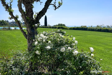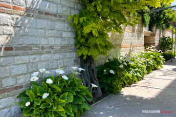 Il viale che porta all’ingresso della nostra villa è stato impreziosito da splendidi cespugli di Calle (Zantedeschia) e da un profumatissimo Glicine (Wisteria) che si arrampica sulla parete in mattoni.