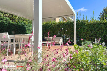 Nella parte più ampia del giardino: gli ulivi, che prima sembravano confinati in un angolo scomodo, sono stati spostati e rizollati con cura. Creando cosi lo spazio su cui ora svetta la pergola bioclimatica, un elemento che coniuga funzionalità e design. La sua struttura moderna si integra perfettamente con il giardino, creando una zona d’ombra piacevole durante le giornate calde e uno spazio riparato nelle serate più fresche. È diventato il nostro angolo preferito per cenare all’aperto, rilassarci e persino lavorare.