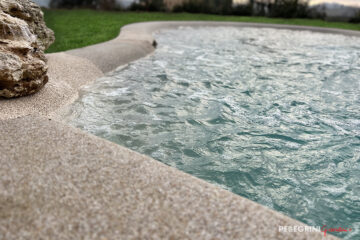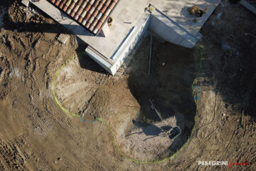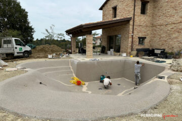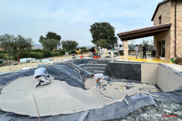 Lo scavo è stato realizzato con un progetto completamente personalizzato in base alle nostre esigenze. Una volta ricavata la forma del terreno ed impermeabilizzato, i tecnici di Pellegrini Giardini hanno formato il rivestimento della piscina, un guscio stratificato di materiale naturale unito a delle resine ecocompatibili.