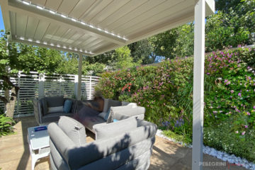 Il risultato ha sorpreso anche noi! La pergola Bioclimatica, in alluminio bianca con il tetto a lamelle regolabili, crea ombra o luce quando desideriamo, una vera innovazione tecnologica.
