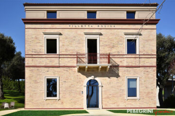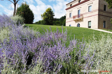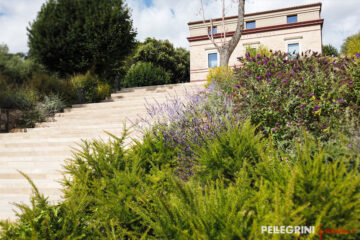 La realizzazione del giardino di questa sede aziendale è partita dallo studio dell’importante dislivello che si veniva a creare tra la struttura principale e il parcheggio riservato ai clienti dell’azienda. Abbiamo optato, assieme all’architetto, per la realizzazione di una grande scala in “lapis tiburtinus” comunemente detto “travertino” tipico del territorio marchigiano.
